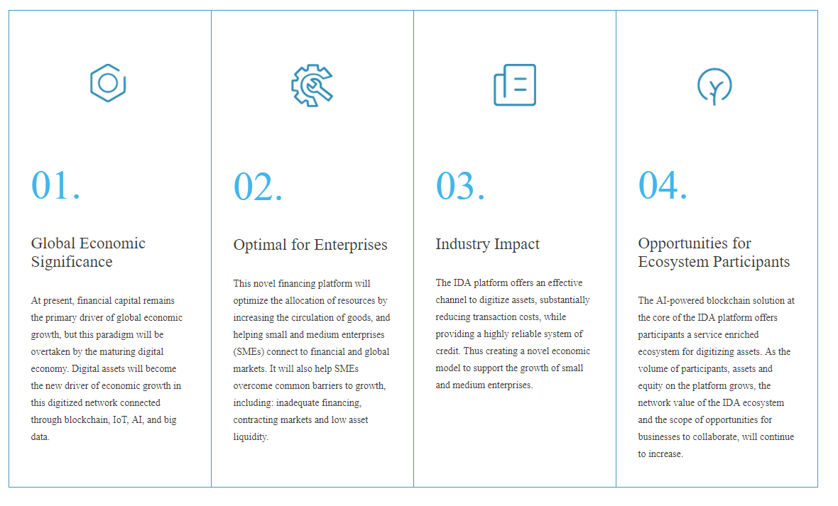 The decentralized IDA platform allows you not only to digitize, but also correctly use your assets. Increasing the popularity of their services and products, small businesses have an excellent opportunity to optimize the use of available funds. Now it will be possible to enter the global market without any particular problems - the assets will be used to the utmost quality and correctness. Small companies will get an excellent chance to become part of the global trading platform and introduce cryptocurrency resources into their work. Companies that belong to small as well as medium-sized businesses will be able to cope with problems that today do not allow them to develop correctly in the existing market - illiterate distribution of financial assets, lack of work with the product and new customers, the problem with the use of available funds.